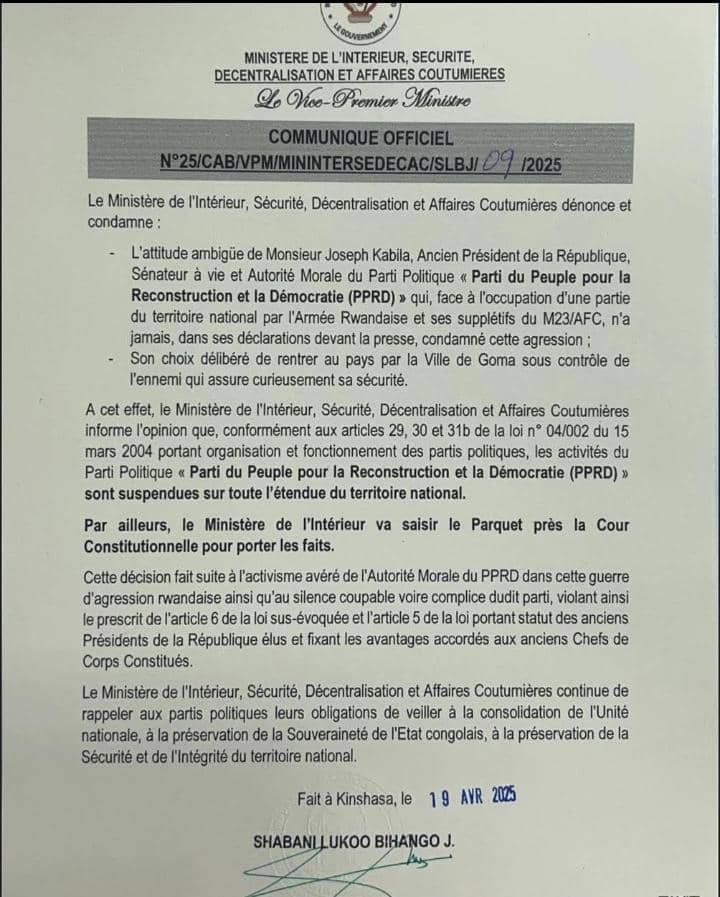 Le gouvernement de la République démocratique du Congo a annoncé la suspension de toutes les activités du Parti du Peuple pour la Reconstruction et la Démocratie (PPRD) sur l’ensemble du territoire national. Cette décision intervient dans un contexte tendu, marqué par l’attitude jugée ambiguë de Joseph Kabila, ancien président de la République et autorité morale du parti, face à l’agression dont est victime la RDC.